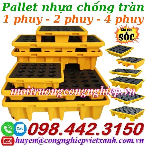 – Pallet nhựa chống tràn là sản phẩm kiểm soát tràn chất lượng cao, bảo vệ cho người lao động và môi trường. Pallet có thể chứa chất lỏng tràn từ 42 lít đến 270 lít tùy theo kích thước khác nhau, giúp lưu trữ và chuyển các thùng dầu, thùng hóa chất dễ dàng và tiết kiệm không gian.